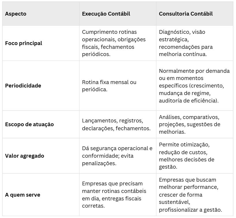 • Alocação adequada dos recursos — execução contábil exige disciplina, equipe ou fornecedores confiáveis; consultoria exige especialistas com visão analítica. Saber o que se precisa permite investir certo.